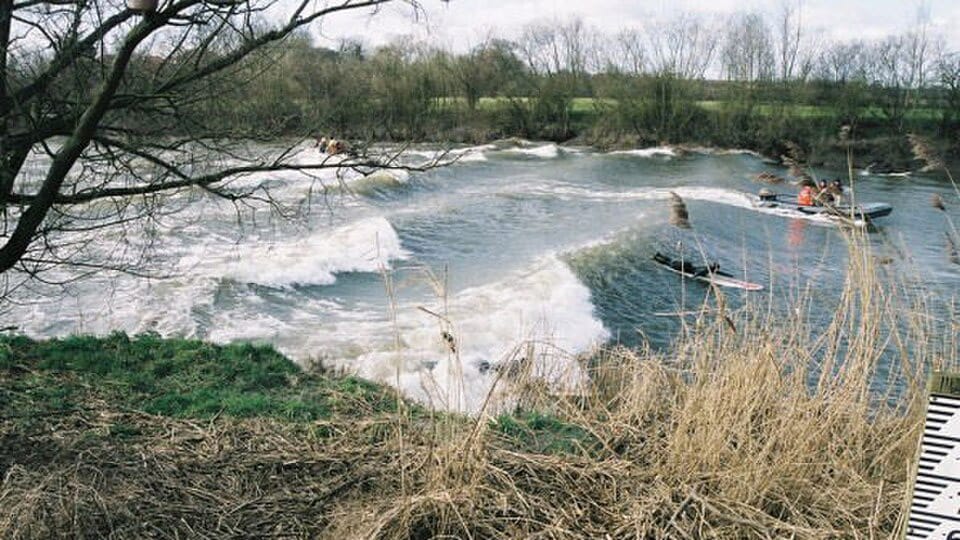 The Severn Bore is a British “surf” break created by an incoming tidal surge funneling up the River Severn (220 miles long), about 100 miles west of London.